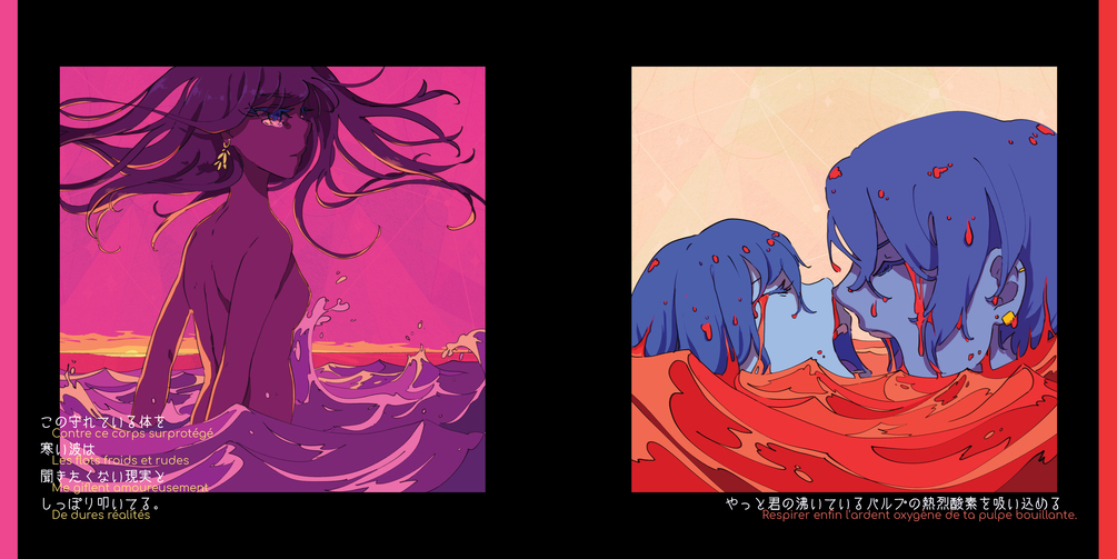 It's a 40 pages full color book, with a first part about liquid, with some french/english and japanese poems. A second part contents some inktober works with intense flat colors.